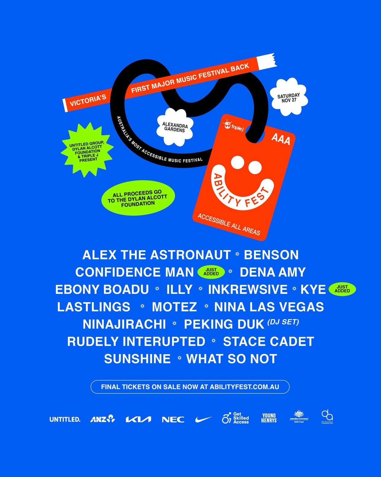 Dylan Alcott. Seeing him on stage and hearing him speak about the purpose of Ability Fest was one of the highlights of the night, putting a day and night of fun into perspective. Discussing the true meaning around the festival's origin, we couldn't help but feel the gravity around what's next in festival inclusion. As the young generations continue to set the example, it was great to look around and know that everyone believed in what was being discussed. Exciting times ahead.